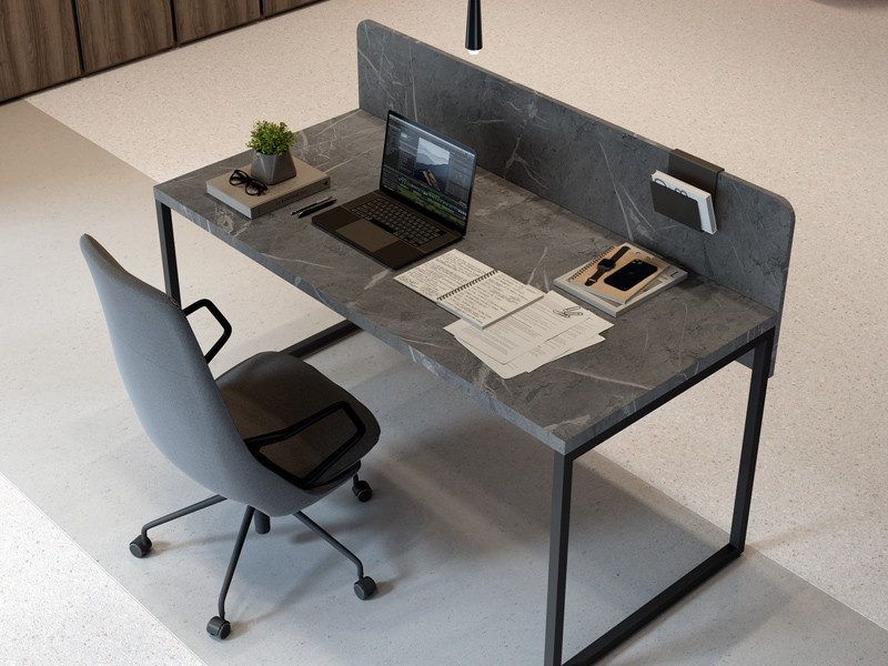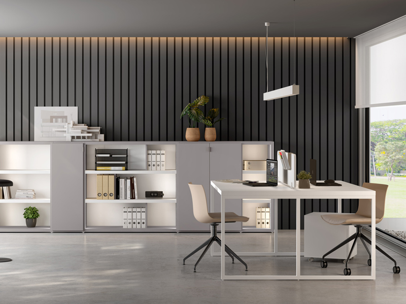 Moble per a una oficina versàtil i funcional, ideal per crear un ambient de treball confortable i ergonòmic sense deixar de banda l'estil. Aquesta composició està formada per una prestatgeria baixa amb 5 prestatges de 38 mm de gruix, que donen un toc de robustesa i atemporalitat al disseny. La prestatgeria també compta, a la part inferior esquerra amb dues portes batents rematades amb ungler de metall i acabat Cacau. A la part central de la composició hi trobem un centre amb taula d'escriptori i potes metàl·liques lacades en blanc.