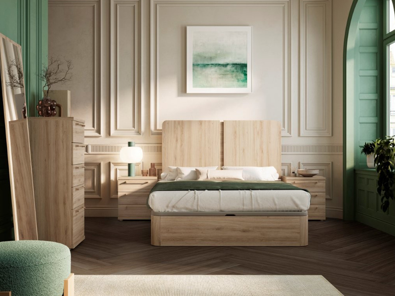 Capçal recte en color roure amb tauletes i xifonier a joc