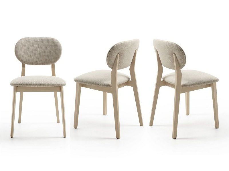 Cadira de fusta natural amb respatller i seient entapissat. Disponible en diferents colors i una àmplia gamma de teixits.