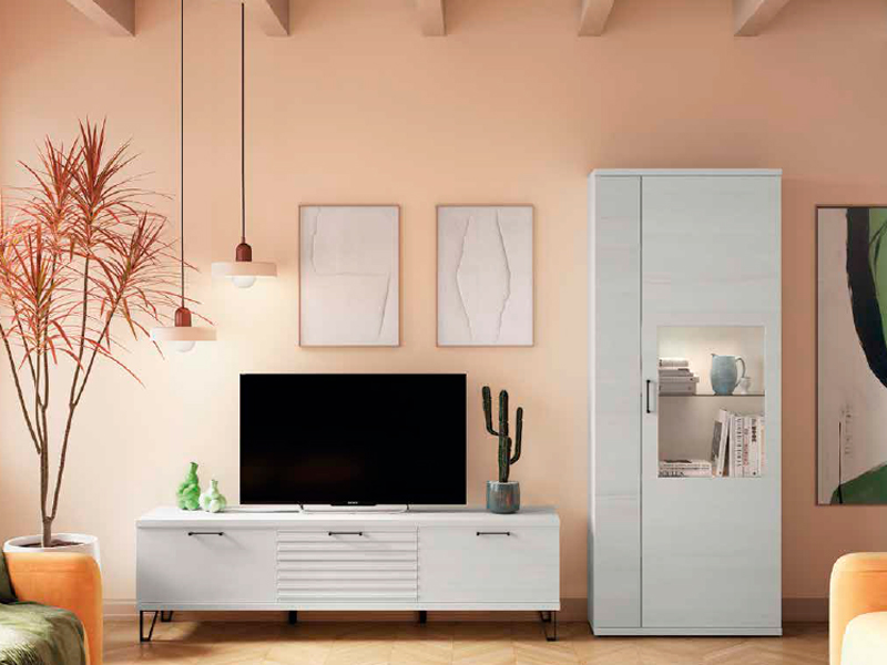 Moble de menjador econòmic en color blanc polar, compost de dos mòduls, mòdul baix per a TV de 180 x 38 x 42 amb patales metàl·liques de color negre i 14 cm. d'alçada, amb una vitrina de portes asimètriques de 80 x 198 x 35 cm. de profunditat amb vidre central a la porta dreta. Disponible en altres mides i combinació de colors.
