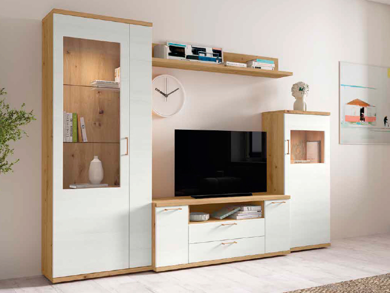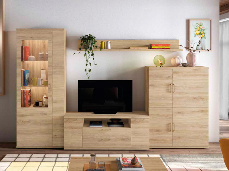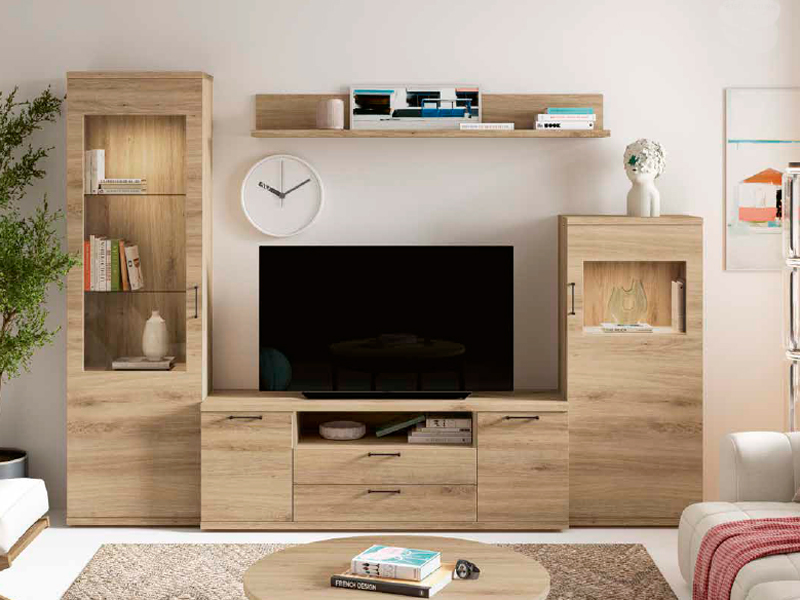 Moble de menjador econòmic en color roure amb àmplia capacitat, compost per: una vitrina de dues portes asimètriques vidre a l'esquerra de 80 x 198 x 35 de profunditat, mòdul baix per a TV amb dues portes i dos calaixos amb forat de 140 x 54 x 42 de profunditat, mòdul bar amb quatre portes asimètriques de 100 x 134 d'alçada x 35 de profunditat i una prestatgeria de 180 x 22. Disponible en altres mides i combinació de colors.