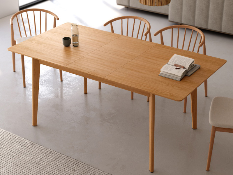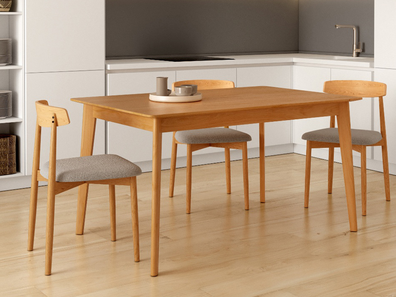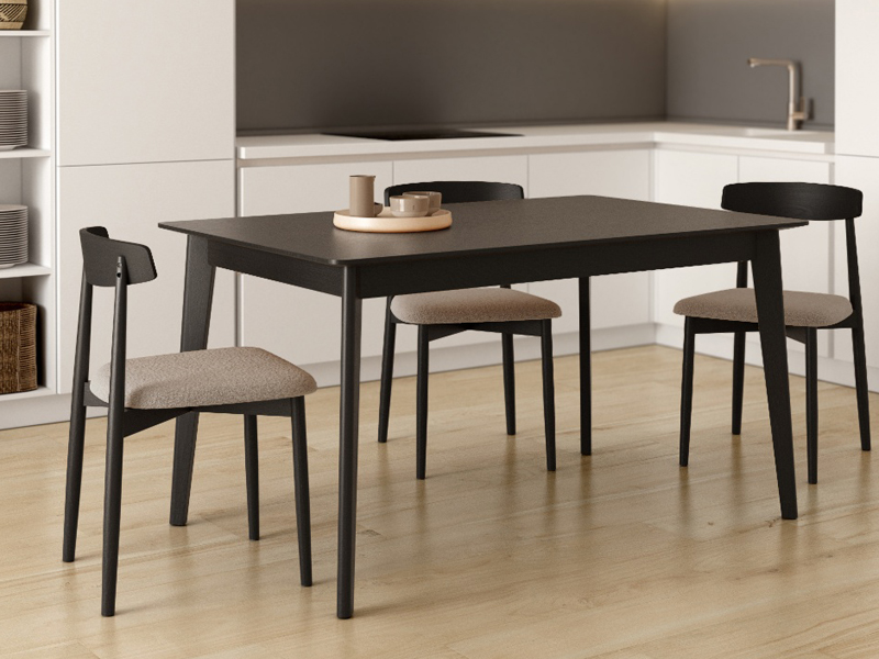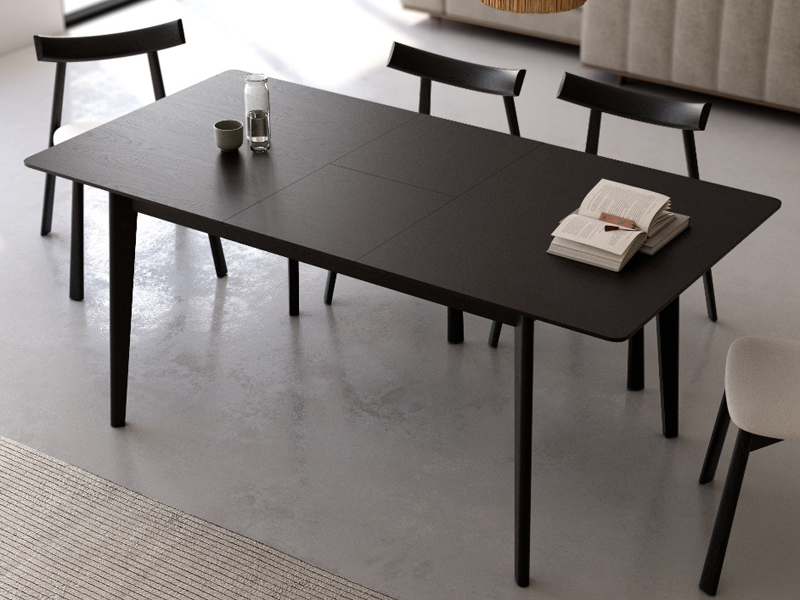 Taula de menjador o de cuina rectangular fixa de fusta amb sobre bisellat de 25 mm de roure negre. Es fabrica en 3 mides; 140 x 90, 160 x 90 i 180 x 90, i de color roure natural. També es pot fer extensible.