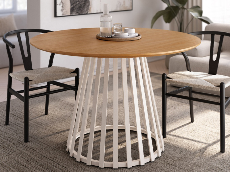 Taula de menjador fixa de melamina de 120 cm. de diàmetre en color roure i estructura metàl·lica en color negre o ivori. Disponible en 6 colors de melamina amb sobre de 22 mm.