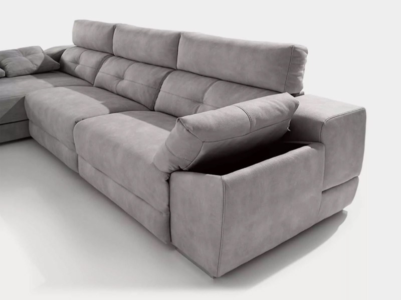 Sofà chaislongue amb seients lliscants motoritzats i la chaislongue lliscant amb bagúl. Amb teixit anti-taques.El braç es bagúl i te pouff. Es pot fabricar en diferents mides.