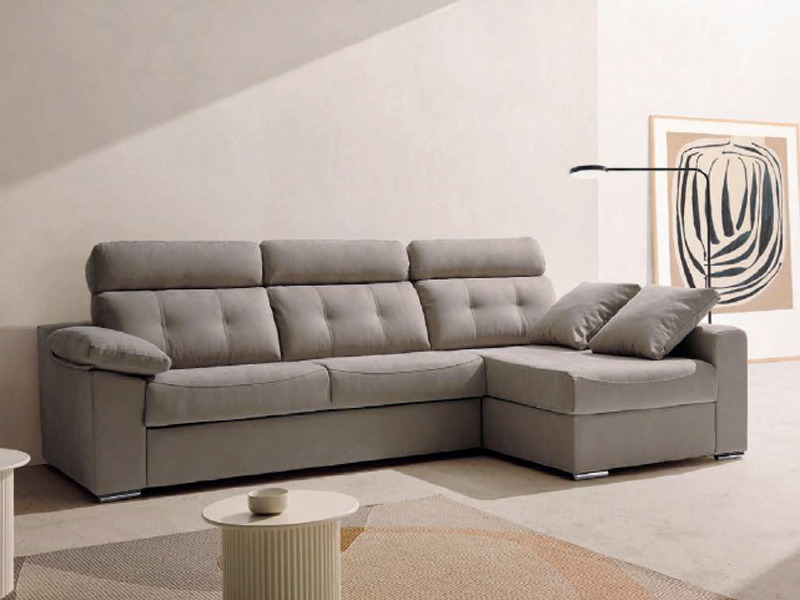 Sofà-llit chaislongue amb sistema d'obertura italiana, molt còmode. Sofà de 287 cm., compost per chaislongue abatible i llit de 140 x 195 (llit obert exterior mesura 2.15). Al sofà de 3 places fa 206 de llarg per 100 cm. de profunditat, amb matalàs de 16 cm. de gruix i de 140 x 195. Disponible en altres mides de matalàs 105 i 160, amb opció de fer el matalàs de Hr i viscoelàstica. També disposa de sofàs fixos; de 2 places que fa 169 i 3 places de 206 fix, i també amb seients motoritzats.
