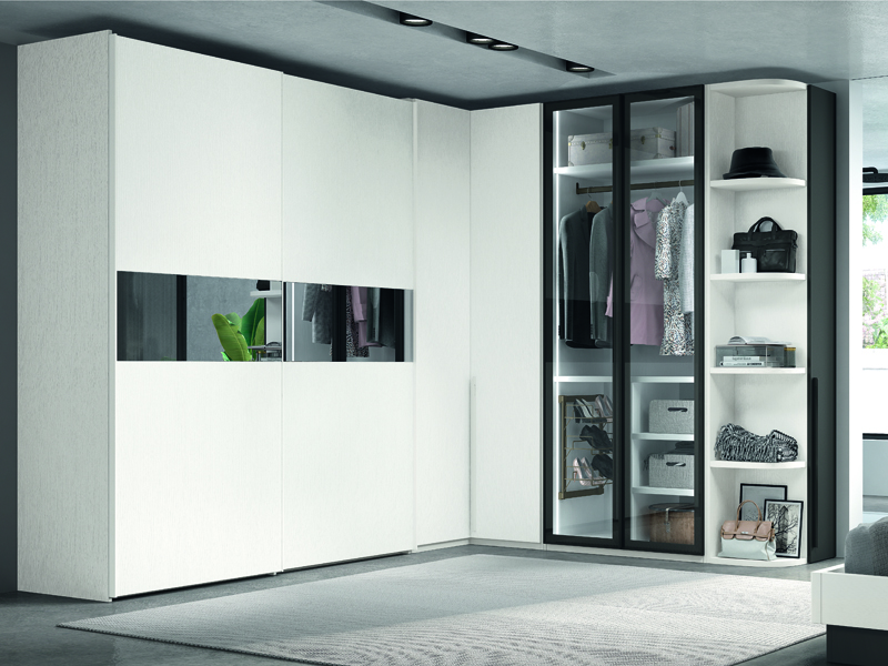 Conjunto de armarios en color blanco y puertas de cristal con marco metálico grafito.