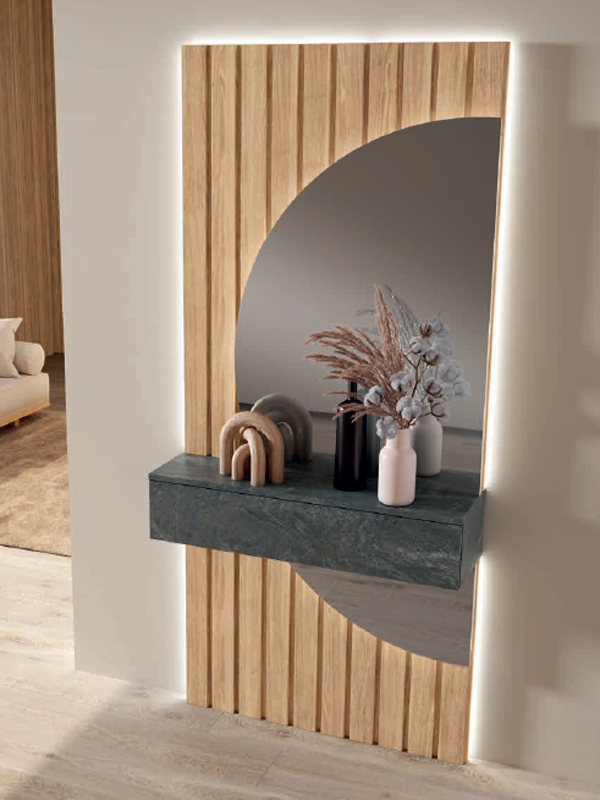 RECIBIDOR CON ESPEJO CURVADO Y PANEL CON LEDS