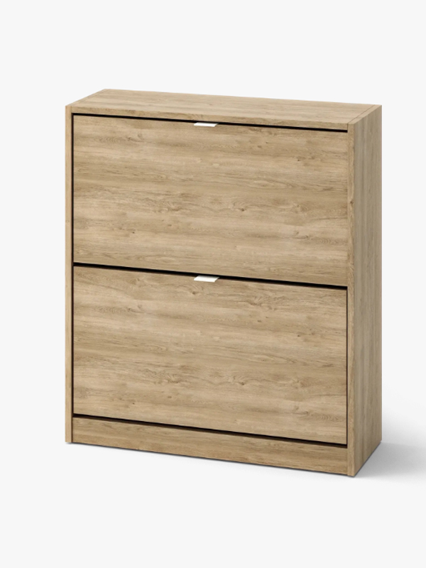Zapatero de 2 puertas abatibles, en melamina de color blanco. Tiene unas medidas de 70 x 81,5 x 25,5 cm. de profundidad. Tiene una capacidad aproximada de 12 pares. Diponible también en roble.