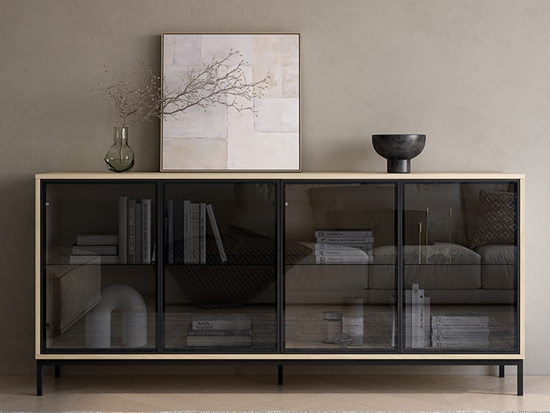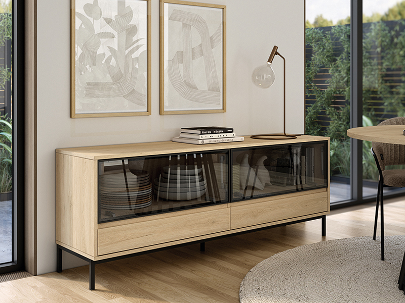 Mueble buffet en color roble con puertas abatible con marco metálico en negro y cristal parsol, con dos cajones, con 45 cm. de profundidad. Disponible en diferentes medidas y combinación de colores.