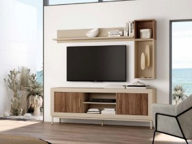 Mueble de comedor económico en color Perla y frentes Java compuesto por un módulo de 90x140 con 2 puertas y 4 huecos, un módulo de tv de 1,50 m y estante de pared de 1,50 m. Las patas son opcionales. Disponible en otros colores