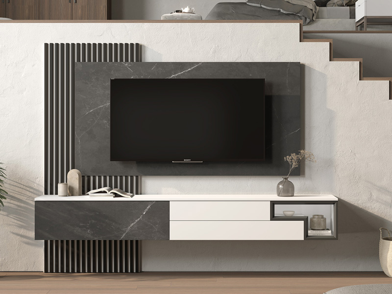 Mueble de comedor moderno en color perla lacado combinado en color porcelánico gris. Compuesto por : palilleria de 90 cm de ancho en grafito y perla, panel de TV de 106 x 210 en color porcelánico gris, módulo de una puerta abatible de 120 en color porcelánico gris y módulo de 150 con 2 cajones y hueco con forma con marco metálico con leds interior. Disponible en diferentes medidas y combinación de colores.