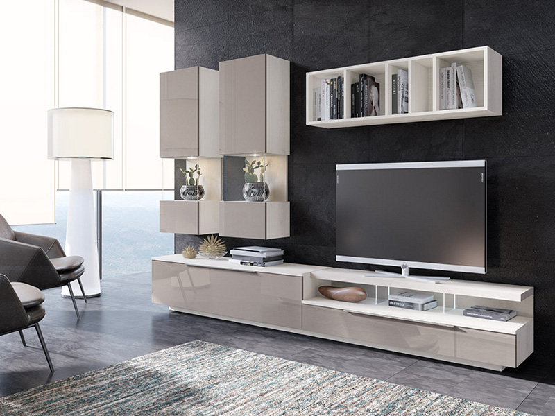 Mueble de comedor en color blanco y frontales en lacado brillo beige, compuesto por : dos vitrinas colgadas con cristal central en color blanco y beige, módulo bajo con puerta abatible de 150 x 37, cajón de 150 x 20 con suplemento TV con cristal de 150 x 17, estantería horizontal de 120 x 35 en blanco y dos zócalos en color blanco. Disponible en diferentes combinación de colores, módulos y medidas.