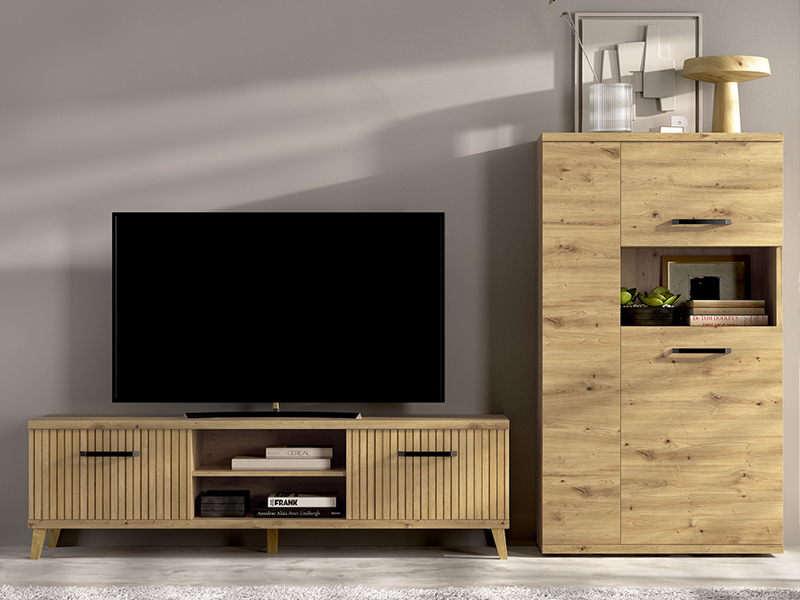 Mueble de comedor en color nordic compuesto por 2 piezas, un módulo bajo de TV de 150 y un módulo alto de 2 puertas con amplia capacidad de 80 x 136 de alto. Disponible en diferentes colores.
