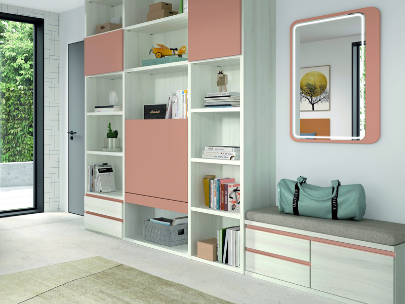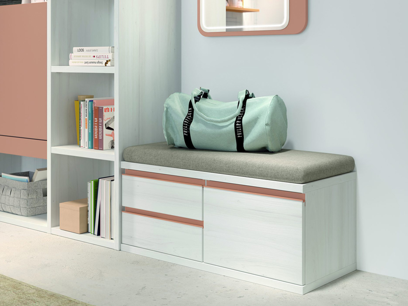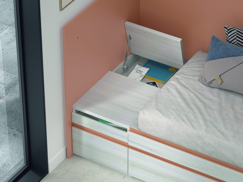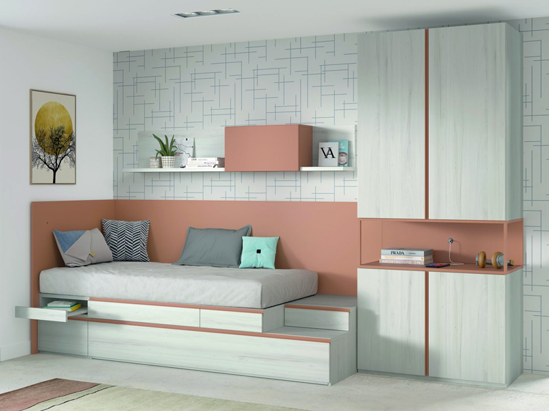 La cama alta incluye prácticos cajones inferiores, cama nido y bandeja y baúl para conseguir más capacidad, un módulo lateral, El cabecero y el panel lateral en color terracota aportan un toque de diseño y personalidad.